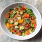 Layered with fresh roasted garlic salsa, plain coconut yogurt, our house blend of spiced taco lentils, grape tomatoes, red onions, sweet peppers, cucumbers, quinoa, romaine lettuce, and topped with garlic flax.